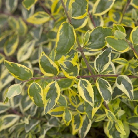 Miss Lemon™ Abelia is a colorful, easy-care shrub with variegated foliage that changes from yellow and green to ivory and green as it matures. It blooms light pink flowers from summer to fall and thrives in full sun to part shade. Growing to 3 feet tall and 4 feet wide, it's deer-resistant, drought-tolerant, and ideal for borders, containers, and low hedges. Suitable for USDA zones 6a to 9b, it requires moderate watering and can be pruned in early spring for shaping. A perfect choice for year-round garden interest.
