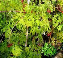 Finely dissected and lacy emerald green leaves emerge a light green before maturing to a darker green. Showy fall color in shades of yellow, orange and red. Its graceful weeping habit gives off a waterfall like appearance.