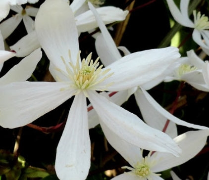 Fast growing, showy evergreen vine to about 20 to 25 feet. Hardy to about 0 degrees F. Partial sun. Large leathery green leaves. Fragrant, star-like white flowers in brilliant clusters. Patios, trellises and arbors.