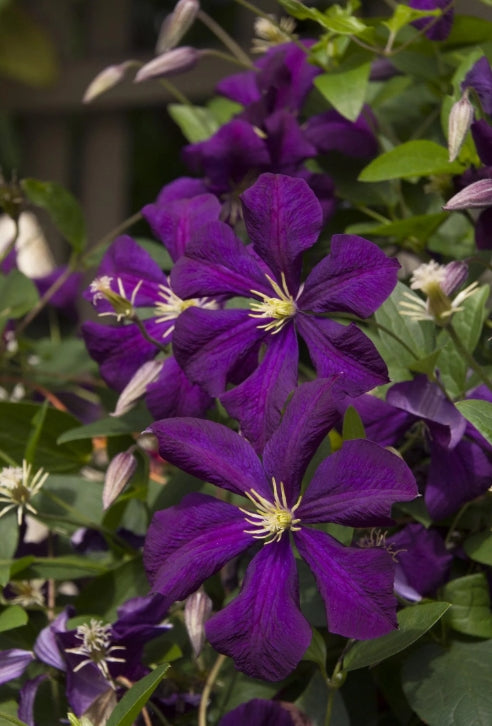 Single, velvetty purple blooms. Classic and very popular variety. Showy when grown against a tall trellis. Pruning group 3.