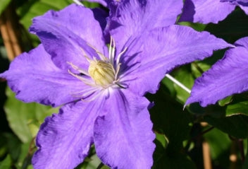 Rapid growing. Clinging deciduous vine to about 8 to 10 feet high. Full to partial sun. 5 to 7 inch lavender blue flowers with creamy white anthers in May, June and September. Prune halfway or more after blooming. Fertile well drained soil.