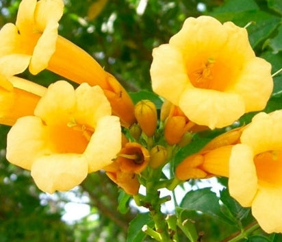 This vigorous, deciduous vine is known for its rapid climbing habit and striking clusters of yellow trumpet-shaped flowers that appear during summer, attracting hummingbirds and pollinators. It thrives in USDA hardiness zones 4-9, requiring full sun to partial shade and tolerating a wide range of soil types, though it prefers well-drained soils. The plant exhibits moderate deer resistance and can grow to a height of 30-40 feet with proper support, making it ideal for trellises, fences, pergolas, or walls. While it does not have notable fall color, its lush green foliage adds a tropical feel to the garden. It can produce small, elongated seed pods as fruits, which add seasonal interest. Hardy and low maintenance, it flourishes in temperatures ranging from 65°F to 85°F. Perfect for adding vertical interest to any landscape!