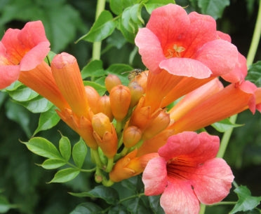 Very hardy, rampant growing, deciduous vine makes an excellent screen or ground cover. Clusters of orange-scarlet flowers bloom July to September. Plant in a protected area. Deciduous vine will grow to 40' high and 30' wide.