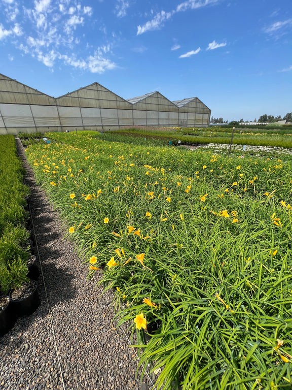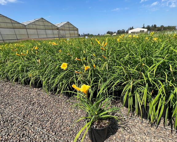 Longest blooming daylily in existence. Produces masses of golden-yellow ruffled flowers in early summer, blooms sporadically throughout the summer, and again flowers in full force in the fall. 12-18" tall. One of earliest blooming and most prolific.