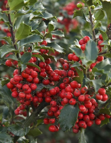 Slow growing, upright evergreen shrub with small white flowers in spring. Purplish-green stems with lustrous, dark green foliage. Profusion of bright red berries is assured with a male and female holly in one container. Excellent as a hedge or when used for flower arrangements.