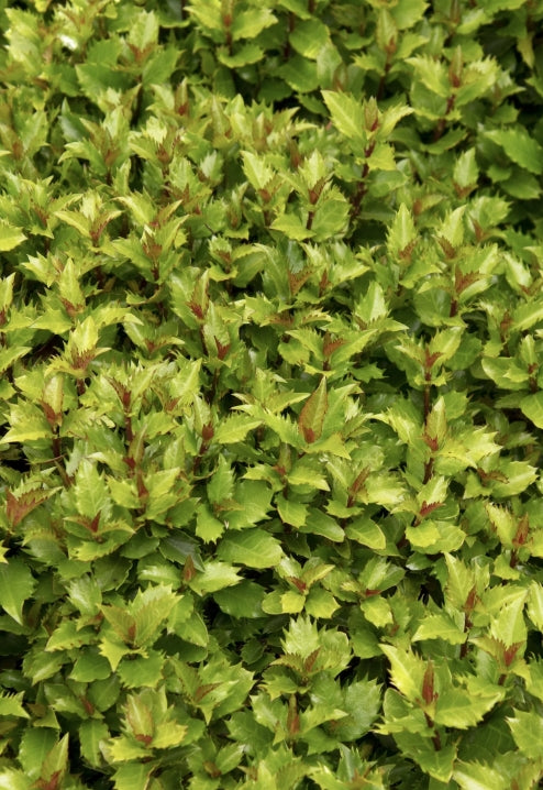 Compact, evergreen shrub with glossy serrated leaves. Burgundy to reddish brown stems. Leaves turn an attractive purple hue in fall. This male variety will not produce berries, but will pollinate other female hollies.