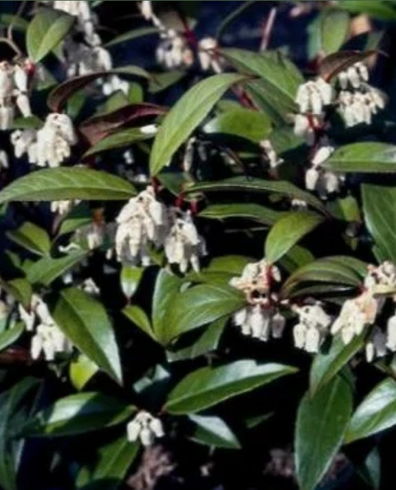 Upright and spreading small evergreen shrub. Leathery, rich green foliage. Urn-shaped, white flower clusters in spring.