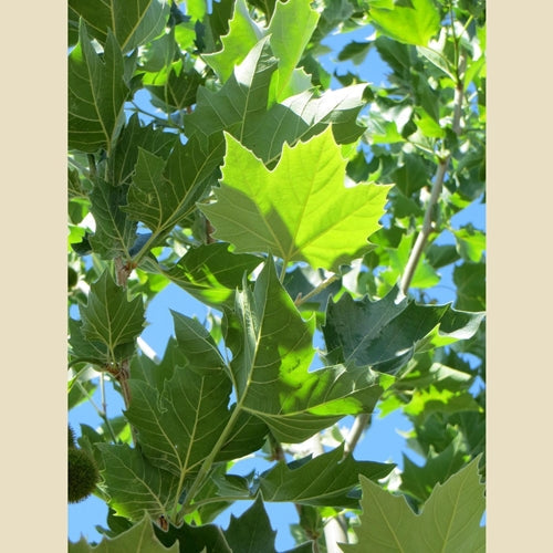 Platanus x acerifolia 'Bloodgood', commonly known as the Bloodgood London Plane Tree, is a majestic deciduous tree renowned for its mottled bark and impressive tolerance to urban pollution. Exhibiting a broad, pyramidal habit, this tree thrives in USDA hardiness zones 5 through 9. The 'Bloodgood' variety boasts dark green leaves that transition to a golden-yellow hue in the fall, adding seasonal interest to any landscape. At maturity, it can reach a towering height of 75 to 100 feet with a spread of up to 80 feet, making it ideal for providing ample shade in large gardens or parks. The tree's robust constitution and striking aesthetic appeal make it a popular choice for city planners and large property owners.