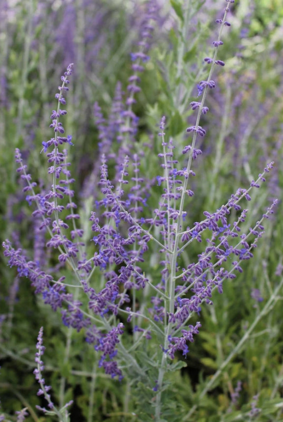 Compact, upright perennial. Finely-dissected, aromatic, gray-green foliage on stiff, upright, square stems. Whorls of 2-lipped, tubular, violet-blue flowers tiered in branched, terminal panicles appear over a long summer bloom.