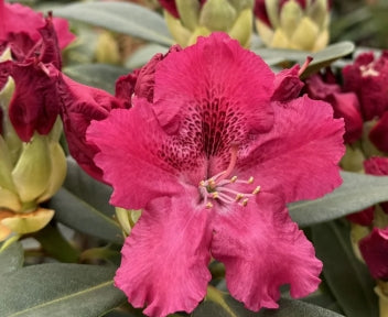HABIT: evergreen shrub --SIZE: 3' in 10 yrs --HARDINESS: Hardy to -15*F --DESCRIPTION: flowers to 2"-1/2" are rosy red, blotched darker in round clusters.