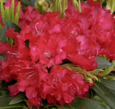 Huge pink satin trusses. Large deep green leaves with reddish leaf stems. 6' tall. Mid season bloom time.