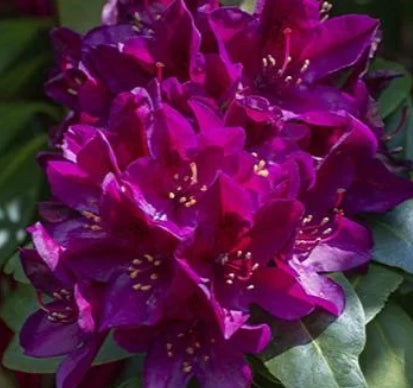 Intensely dark purple, frilly blooms with red throats and white stamens. Dark green evergreen foliage grows wider than tall. Name means Polar Night.