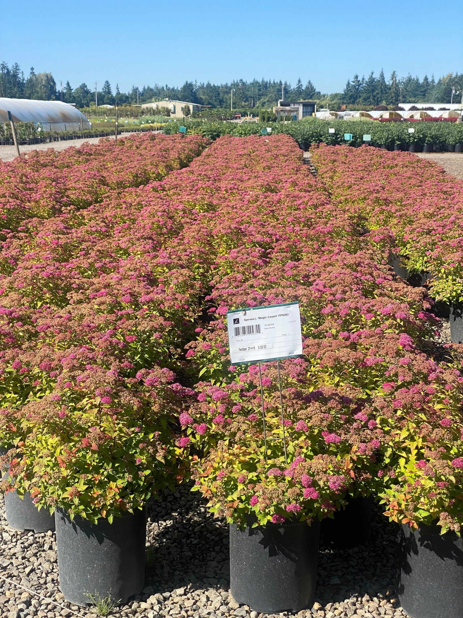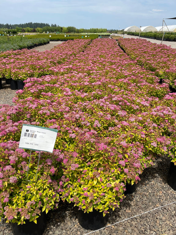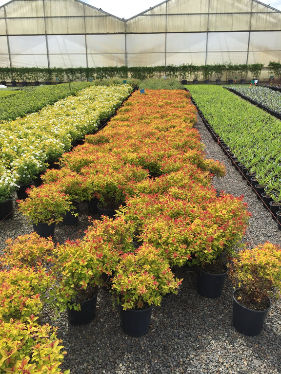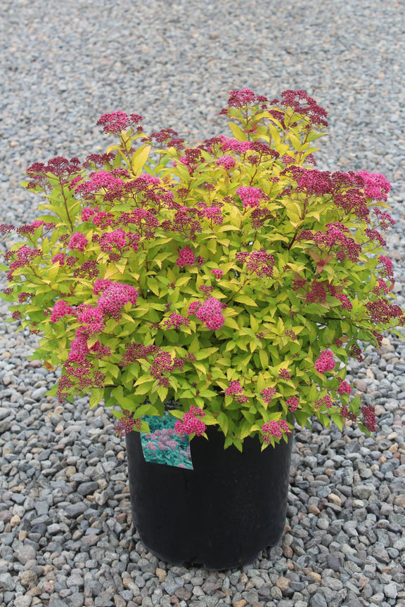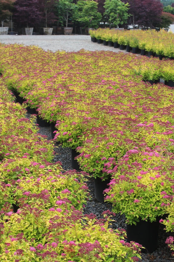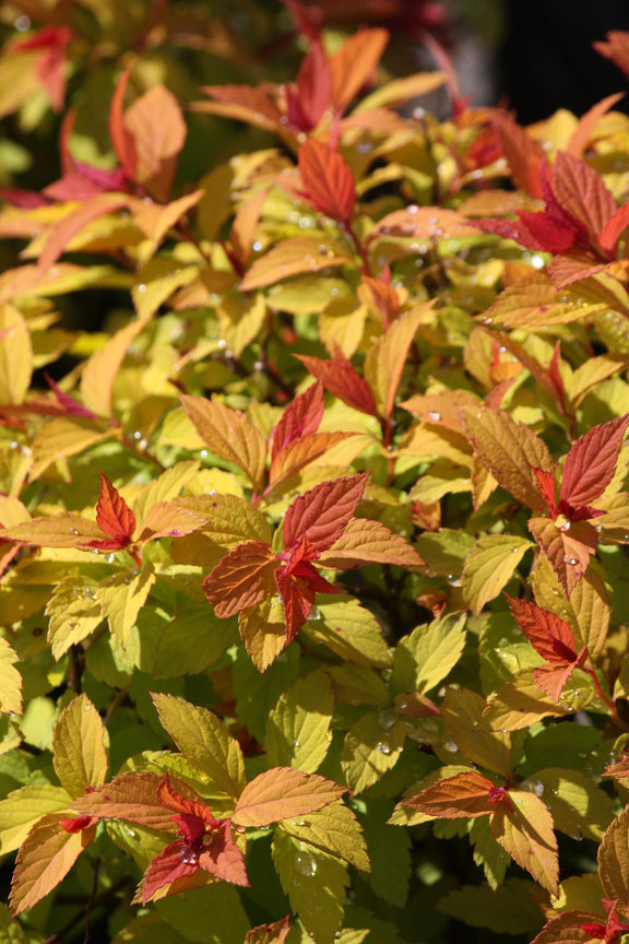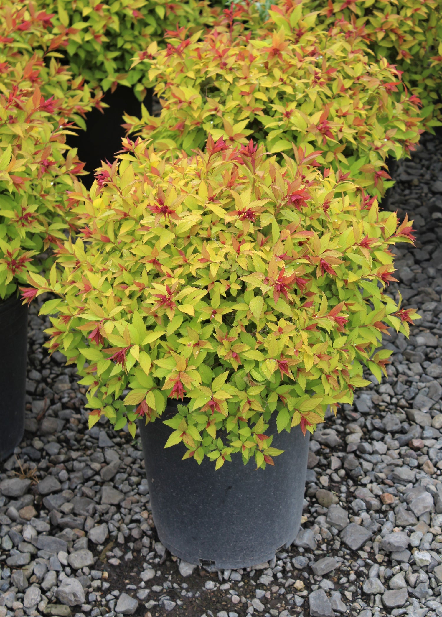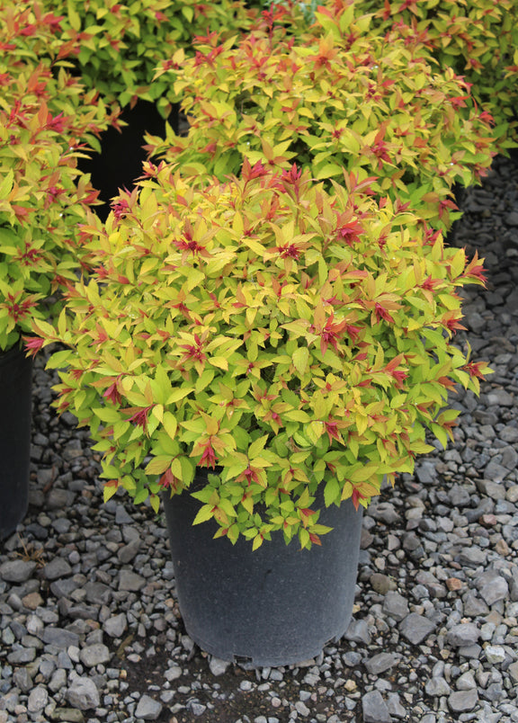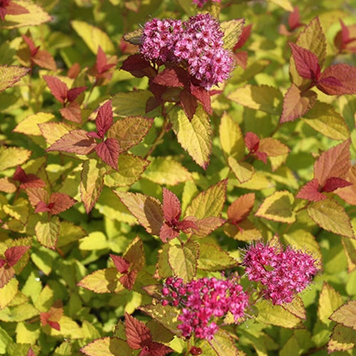 This compact deciduous shrub features a dense, mounded habit, making it an excellent choice for ground cover, borders, or mass plantings. It is hardy in USDA zones 4-9 and thrives in full sun to part shade, preferring well-drained soils but tolerating a range of conditions. New foliage emerges with vibrant red tones before transitioning to bright golden-yellow hues, while fall foliage turns a rich, russet orange. Small clusters of deep pink flowers bloom throughout summer, adding long-lasting seasonal interest. This low-maintenance shrub typically reaches a mature height of 15-24 inches with a spread of 18-24 inches, making it deer-resistant and drought-tolerant once established. Its vibrant foliage and compact form make it a standout in any landscape.