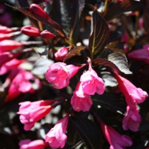 Compact, well branched deciduous shrub. Glossy, dark, burgundy-purple leaves. Hot rose pink, tubular flowers bloom from May to June.