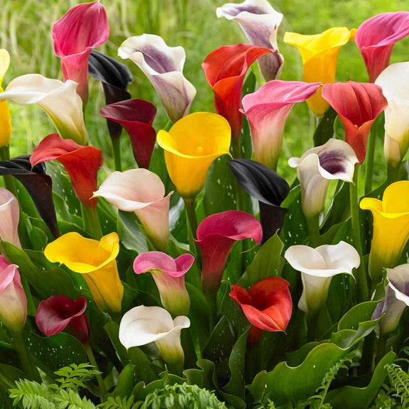 Zantedeschia, Mix (Calla Lily) is a striking perennial known for its elegant trumpet-shaped flowers that come in a variety of colors including shades of pink, yellow, white, and purple. This plant exhibits an upright, clumping habit and makes a beautiful addition to garden beds, borders, or containers. It thrives in USDA hardiness zones 8-10, preferring mild climates with recommended temperatures ranging between 60-75°F. Calla Lilies reach a mature height of 1 to 3 feet and typically do not exceed 1-2 feet in spread. While they are moderately deer-resistant, some protection is still advised. Ideal for cutting gardens, their stylish blooms are long-lasting in floral arrangements, adding a touch of elegance to any setting.